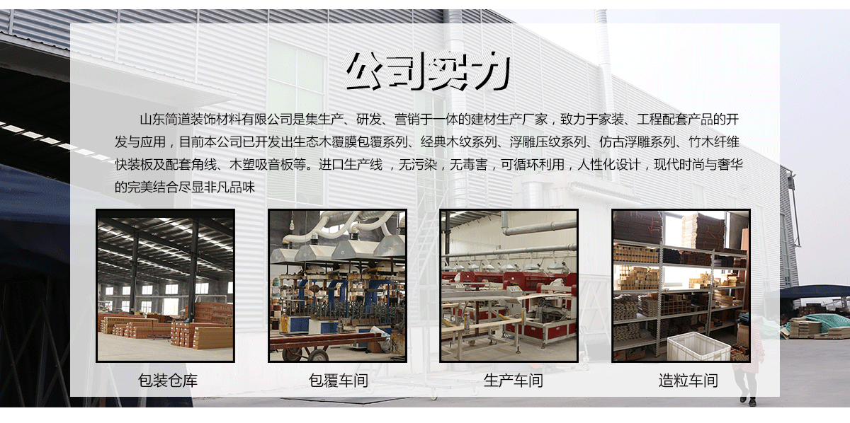 方通方木、吸音隔音板、共擠木塑地板、木飾面快裝墻板等。