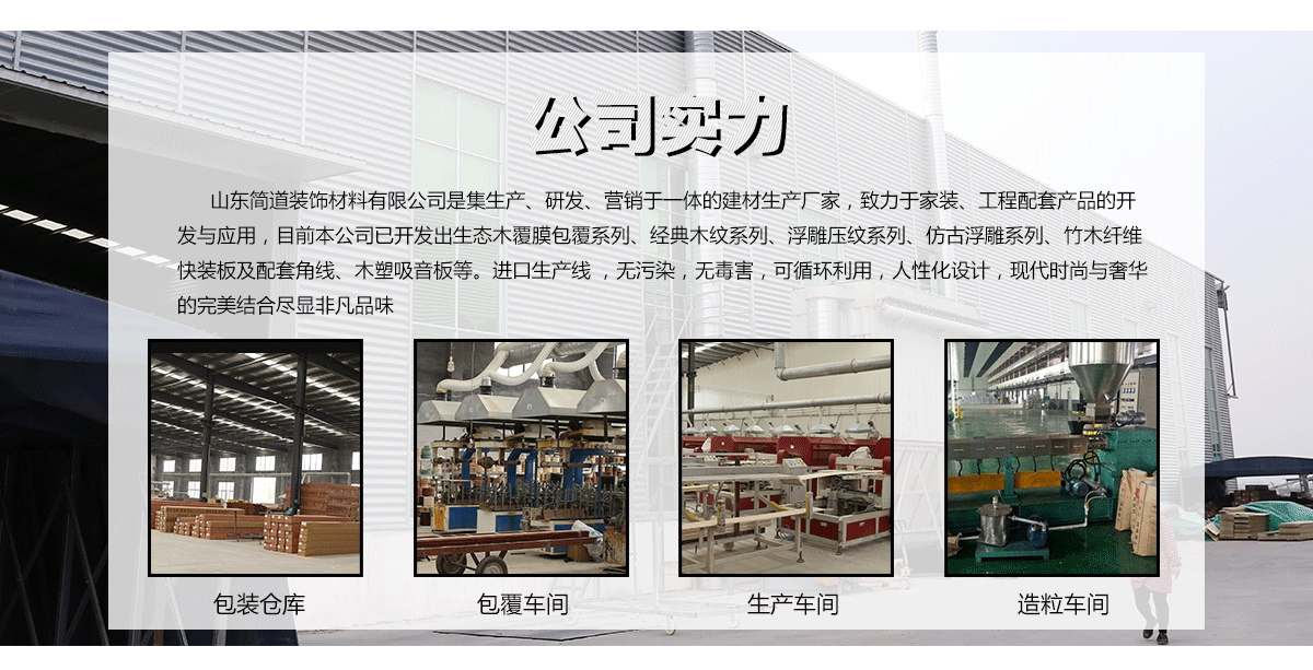 方通方木、吸音隔音板、共擠木塑地板、木飾面快裝墻板等。